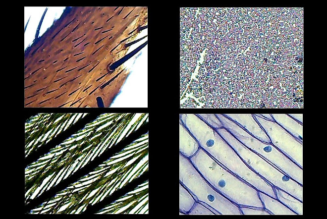 Para ello he utilizado una cámara especial adaptada a un microscopio. En estas cuatro imágnenes pueden contemplarse las vellosidades de la pata de un insecto, globulos rojos de la sangre, la estructura de una pluma de pajaro y por último la estructura de una celula vegetal con el nucleo teñido de azul.